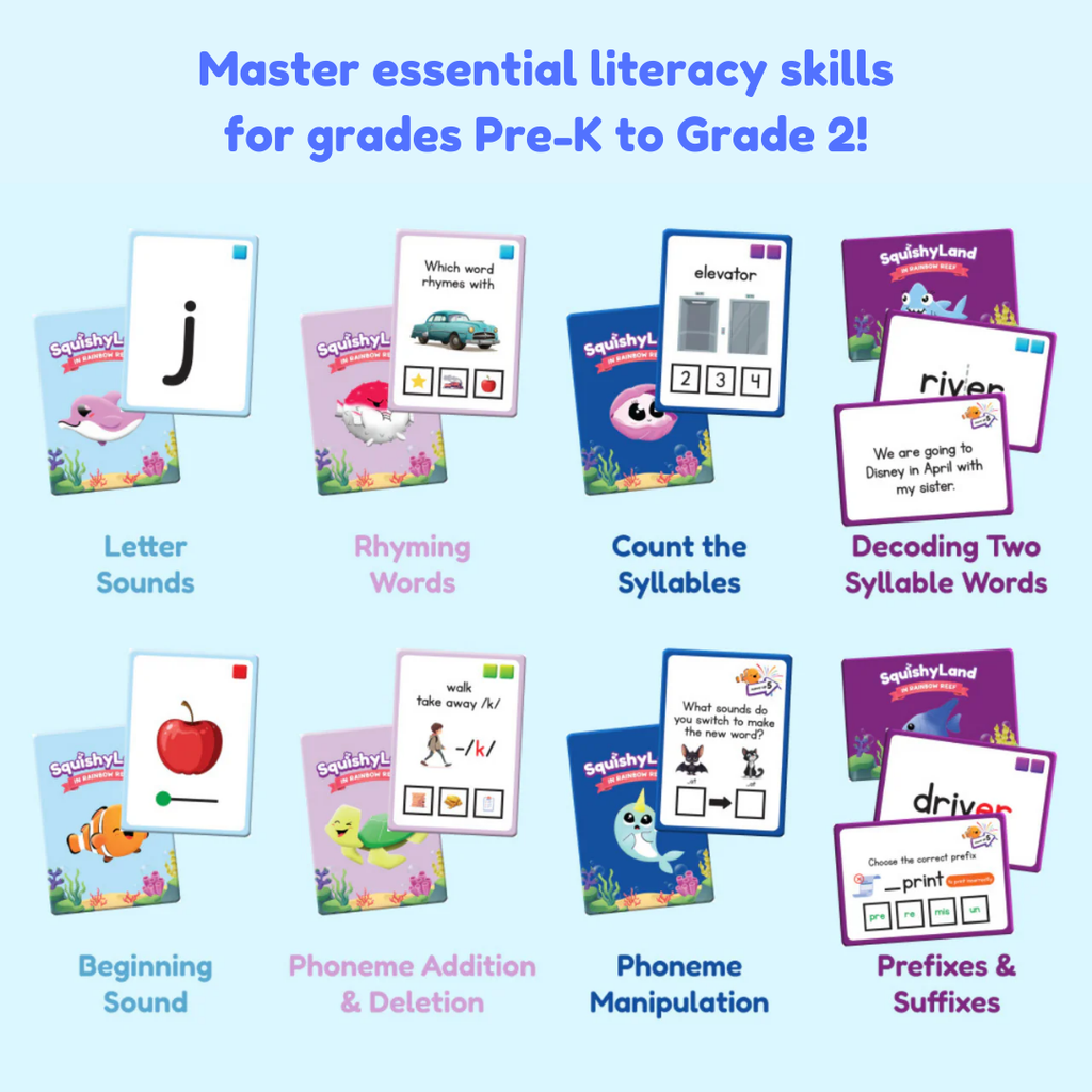Squishyland is an interactive, story-based reading board game developed by teachers specializing in the Science of Reading (SoR). Designed for young learners, it features card packs from Pre-K to Grade 2, covering all foundational literacy skills. With Squishyland, learning isn’t confusing or stressful—it’s an adventure!