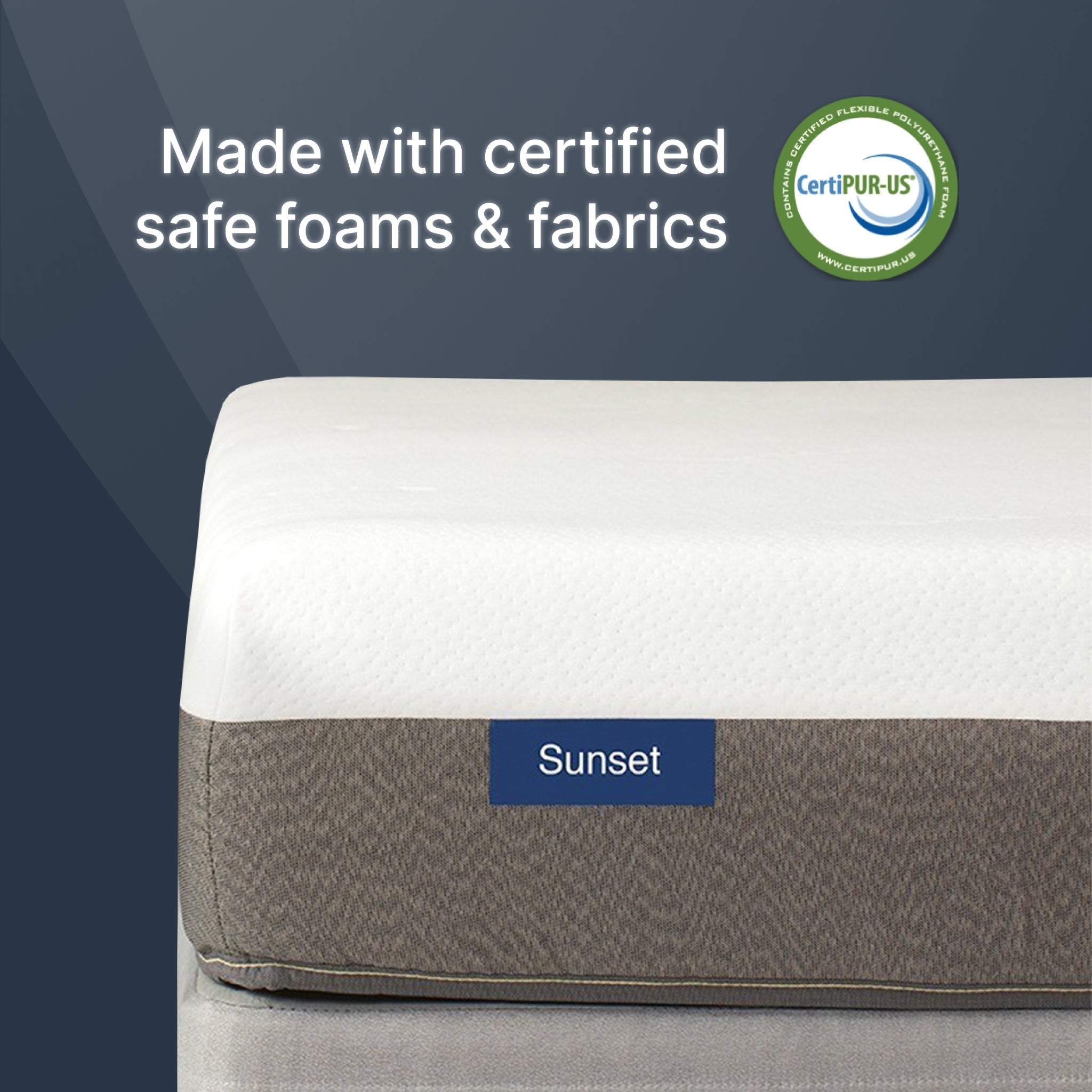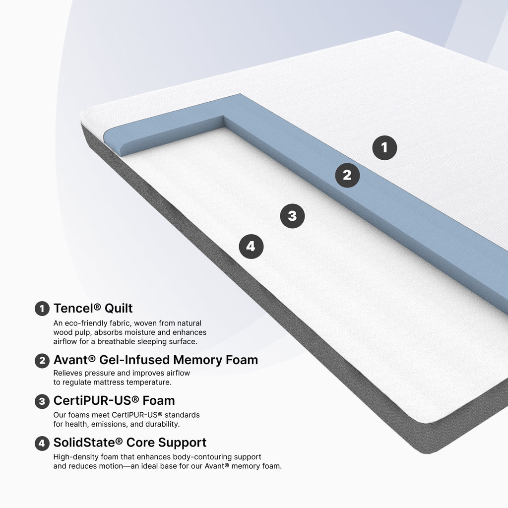 A memory foam mattress from the Avant® Collection, the Sunset has a medium-feel. It features a Gel-infused Memory foam comfort layer and natural Tencel ticking, for a cool, soft and refreshing feel.