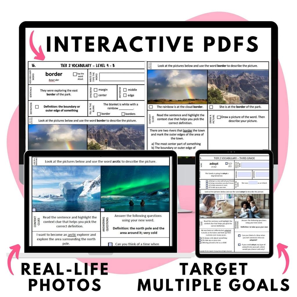 1. Materials that will work with both in-person or tele-therapy. All materials are interactive PDFs and can be used digitally making them perfect for tele-therapy. That means no more time spent printing, prepping, and laminating materials.