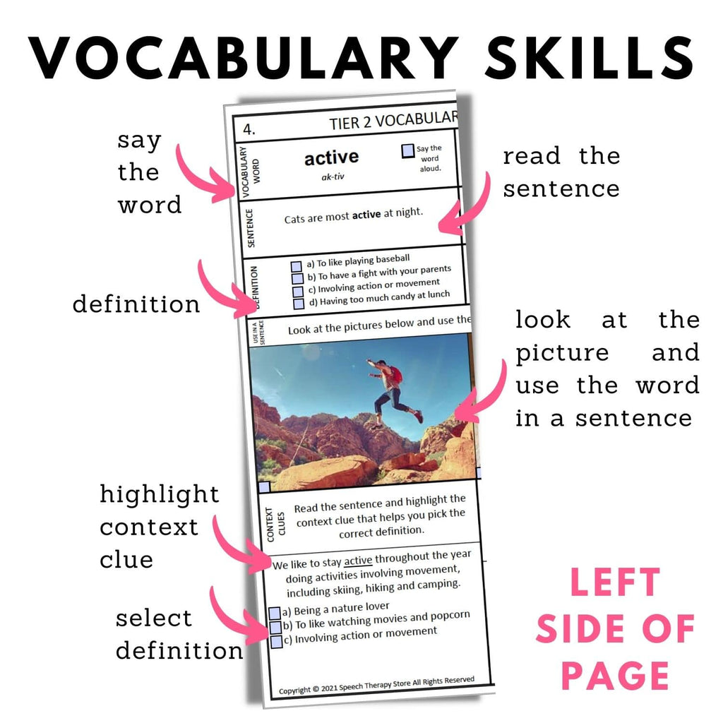 1. Language: Say the vocabulary word aloud, write or type the vocabulary word, read the word in a sentence, identify a synonym and/or antonym, select the correct definition, fill in the blank sentence, use the word in a sentence using the two given real-life photos, highlight the context clue, select the correct definition based on the context clues given, answer questions using the new vocabulary word.