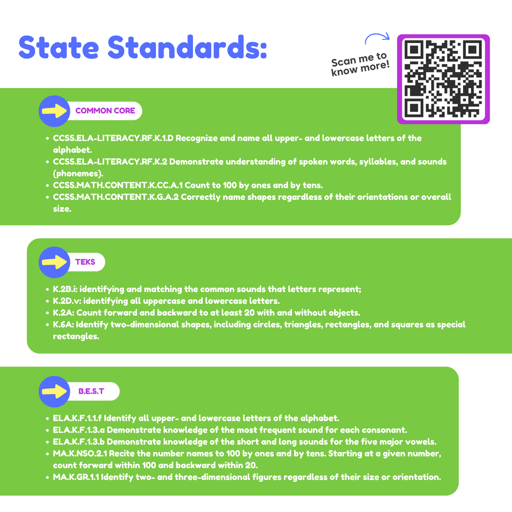 Develop all your grade-level skills, including ABCs, numbers, counting, colors, and 2D shapes