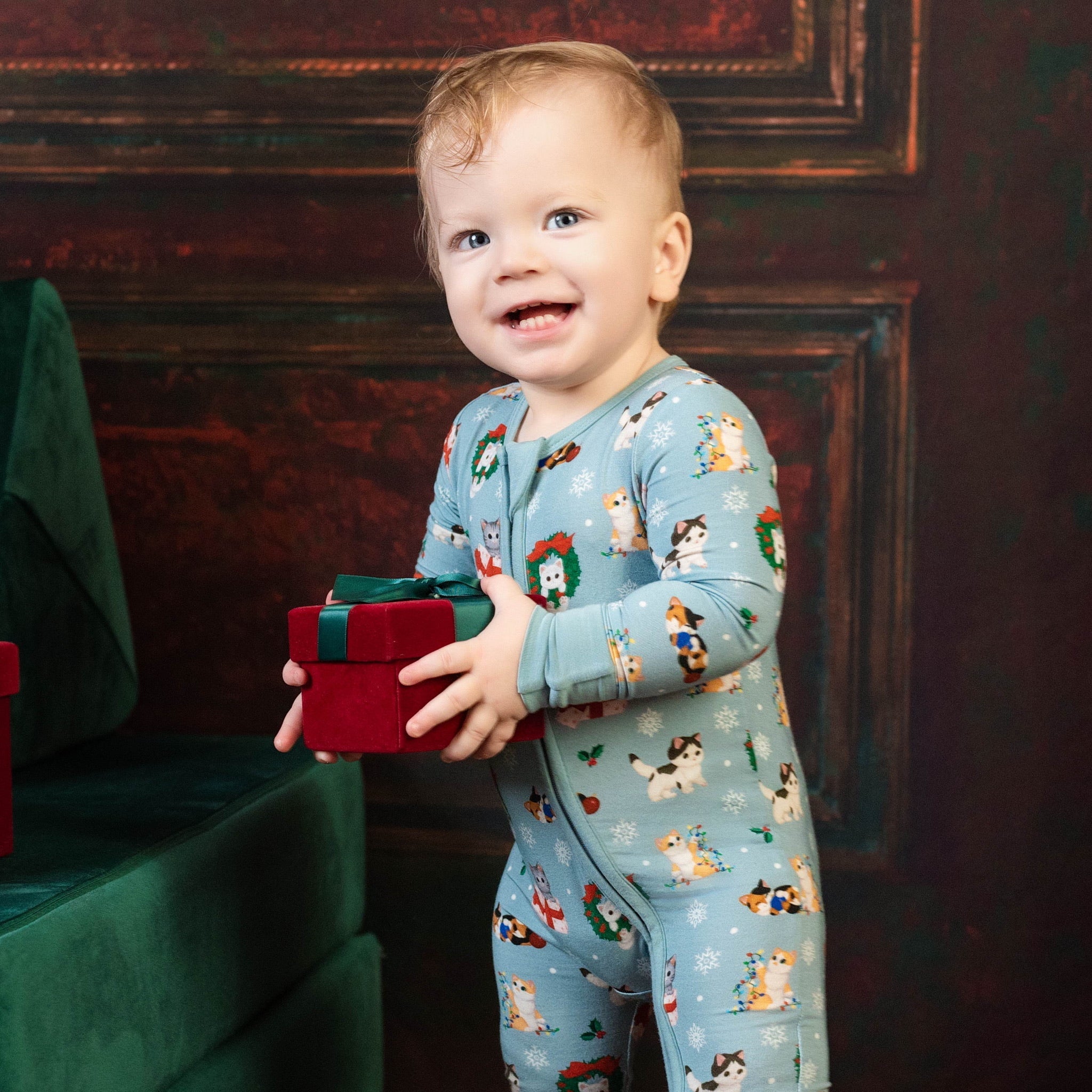 Popoki exclusive hand drawn print features a calming winter blue background with holiday fun vintage Christmas kittens.