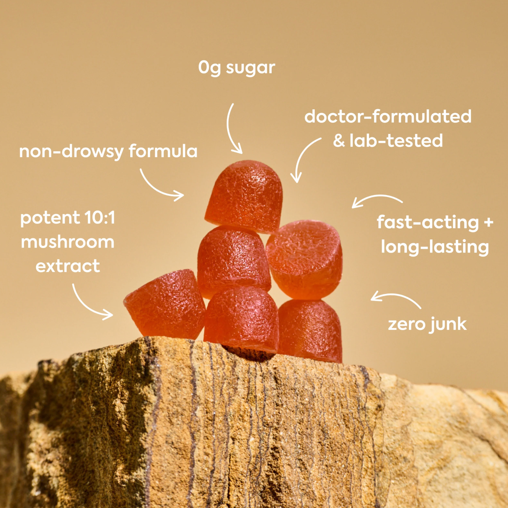 Zero-sugar, mushroom gummies that help ease stress, anxiety and promote a good mood without leaving you drowsy*.