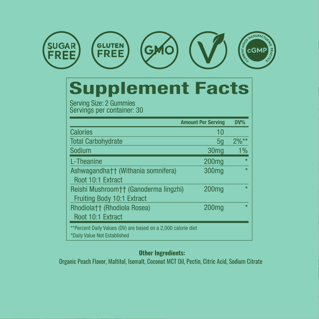 Each serving contains over 900mg of Ashwagandha, Reishi, L-Theanine and Rhodiola. 60 gummies per pouch. 30-Day supply.
