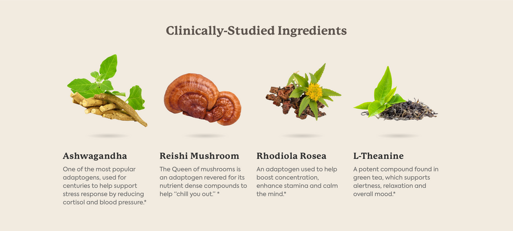 Ashwagandha, Reishi, Rhodiola and L-Theanine have been revered globally for centuries. These time tested ingredients support the mind and body to build energy, stamina, mood and increase performance during stressful times.